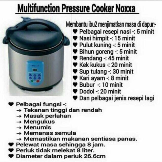 Panduan umum masa masakan (olahan dn tips dari cik kiah. Aku rebus daging guna periuk noxxa. Untuk mudah nak faham, kalau biasa kita rebus daging dalam periuk atas tungku api kita rebus pada suhu 100 d celcius, dengan periuk tekanan kita masak pada .